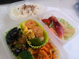 なす味噌いため(ブロッコリーの芯入り)、えびとピーマンの中華風卵とじ、人参しりしり、ゆでブロッコリー、ピクルス(トマト、みょうが、きゅうり、人参)、新ショウガの甘酢漬。