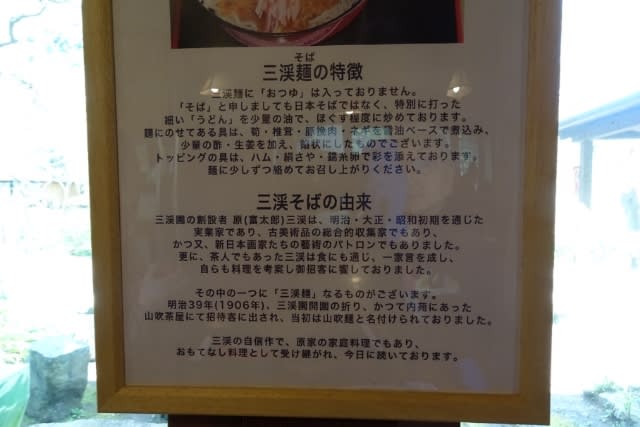 「三渓園には原三渓さん考案の『三渓そば』なる名物があるらしいよ!なんでも茶席出席者の着物を汚さないように汁なしのそばだったんだって」