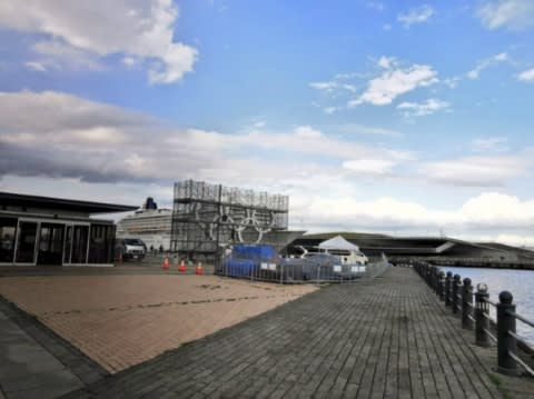 そして、赤レンガ倉庫の脇に設置工事中の五輪の電飾。