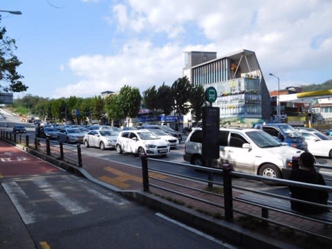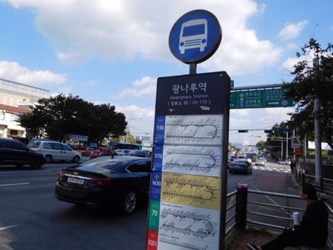 地下鉄でクァンナル駅まで行きそこから地上に出てバスに乗り換えろというグーグル先生のお告げ。川の近くなので道幅広い!バス停は車道に島が作ってある。目指すバスはすぐに来た。