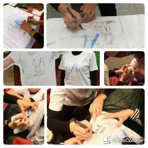 自分が描いたイラストが Tシャツに印刷され それを皆が着て サインを求められる 私なら!!!!的な表現を連発するのに 随分おさえた書きぶり もしかしてもうサプライズでは無くなった? それとも新しいイラストの注文を受けて 戸惑っている? 悔しいくらいうらやましい