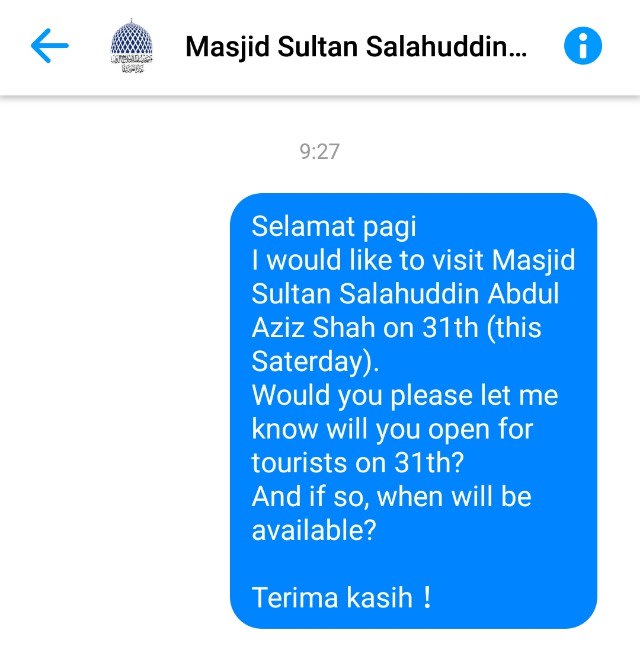 マレーシアのブルーモスクに行きたいけど、祭日にあたってるので見学可能時間を確認したいなーとおもったら、かのモスク、Facebookページをお持ちでした。早速翻訳サイトなどを駆使して問い合わせ。