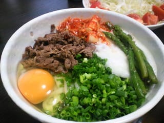 写真はお抱えシェフによる「ぶっかけ、とろろ肉キムチ うどん」です。オイチカッタ。