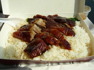 空港で食べる、ローストグーズ弁当とピータンをテイクアウトする。