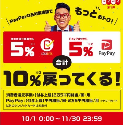 さっき、ペイペイのホームページを見たら、10月~11月は「最大10%還元」を始めるらしいです。対象店舗で5%+ペイペイ独自で5%