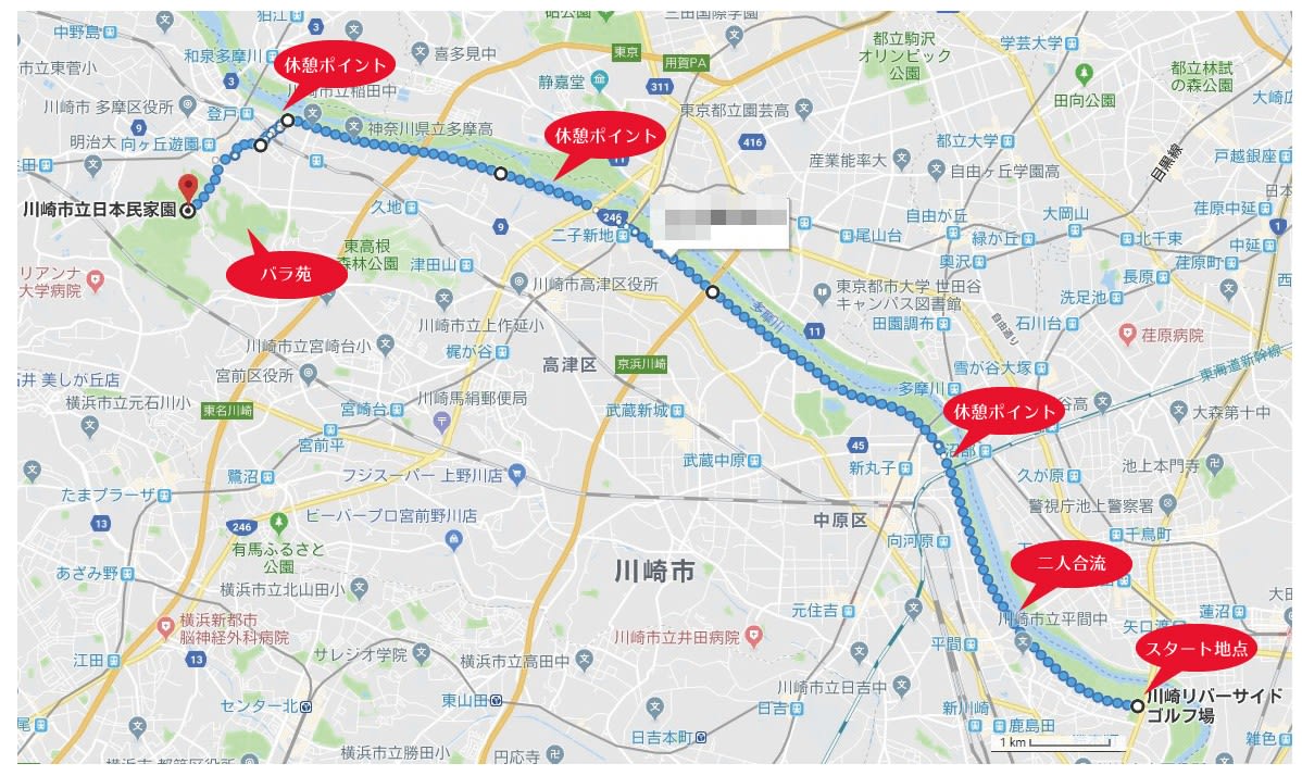 朝8時に多摩川大橋に集合し、川崎市側をさかのぼります。自転車を持っていない友人は、シェア自転車を借りてきました。東京のシェア自転車はすべて電動アシスト自転車なんですよ!