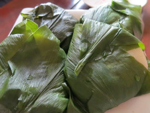 小豆あんのおまんじゅうをみょうがの葉っぱで巻いて蒸したものです。みょうがの葉っぱの独特の香りが、まんじゅうに風味を添えるのです。茗荷が入っているわけではありません。