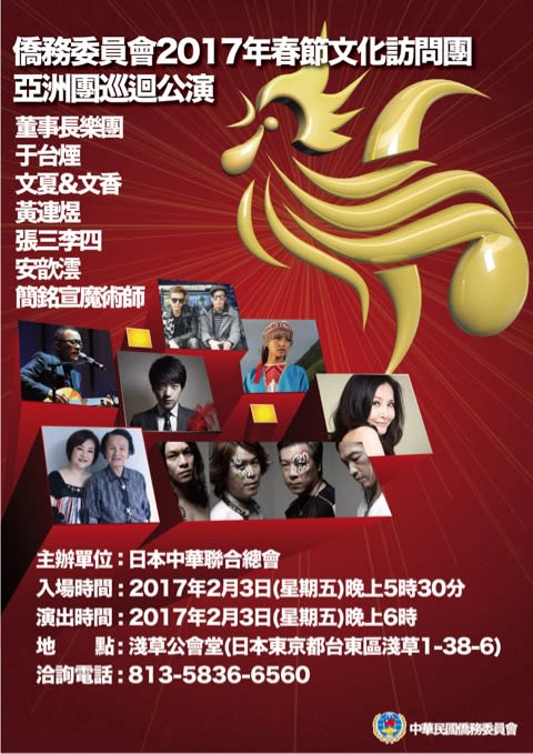 華僑協会みたいな組織があって、そこの主催で日本と東南アジアの7カ国(日本、フィリピン、マレーシア、インドネシア、ベトナム、カンボジアとあと何処だろ?シンガポールかな?)、13都市をめぐる春節訪問団を組織して各地の華僑の皆さんを招待するイベントを開催するというもの。出演者は一部変わりつつも1ヶ月間のツアーになるのだそう。だから出演者も豪華なのですね。