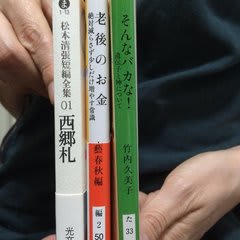 最近ネットで「文庫川柳」とか言うのがちょっと流行ってるらしい。どういうなのかな?と、のぞいてみると、手持ちの文庫本のタイトルを何冊か並べて、川柳に見立てるというもののようだ。早速本棚の前で、あーでもないこーでもないとやってみた。