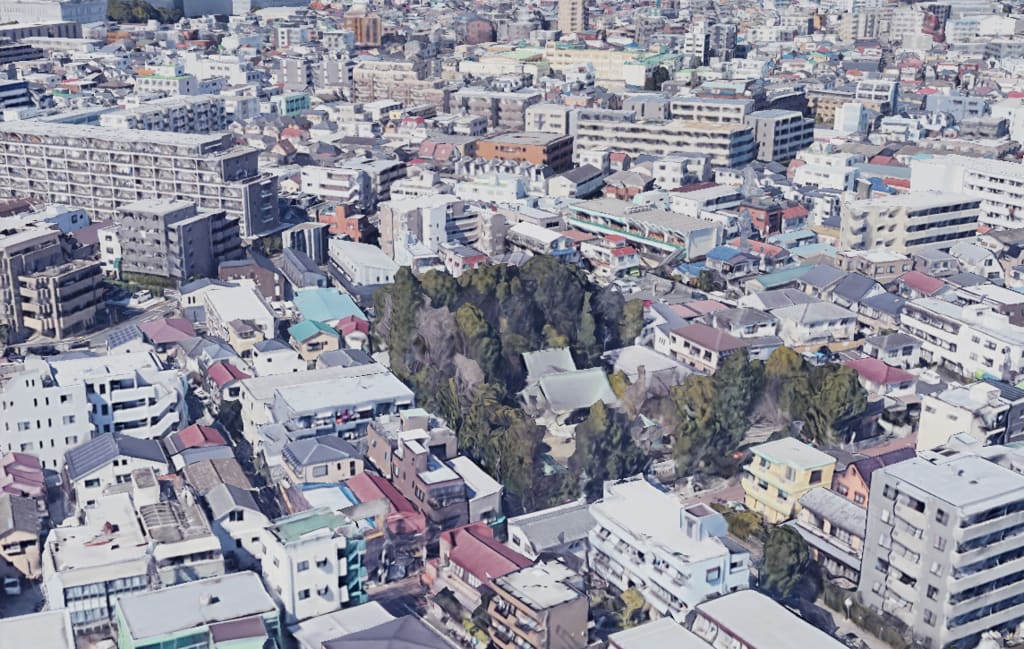 GoogleEarthで同じ角度から俯瞰した現在の新田神社。