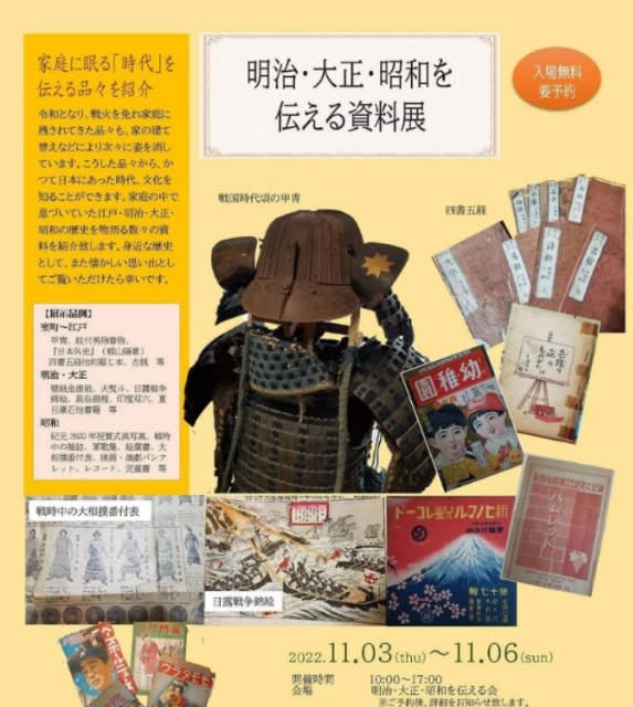 先祖伝来の甲冑や、御下賜の着物などの珍しいものや戦前戦中戦後の懐かしい物なが登場するそうです。