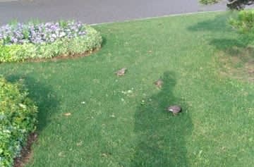大型の親鳥一羽につき、ふた周りほど小柄なひな鳥2羽の割合で、あちこち歩き回っています。