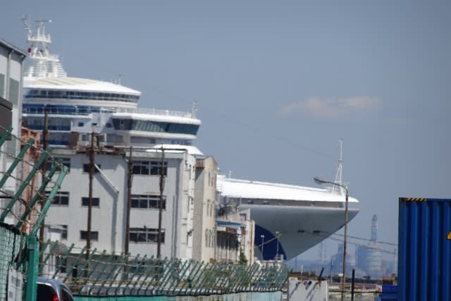 と、そのとき、ダイヤモンドプリンセスらしき船の舳先が建物の間からチラッと見えました。
