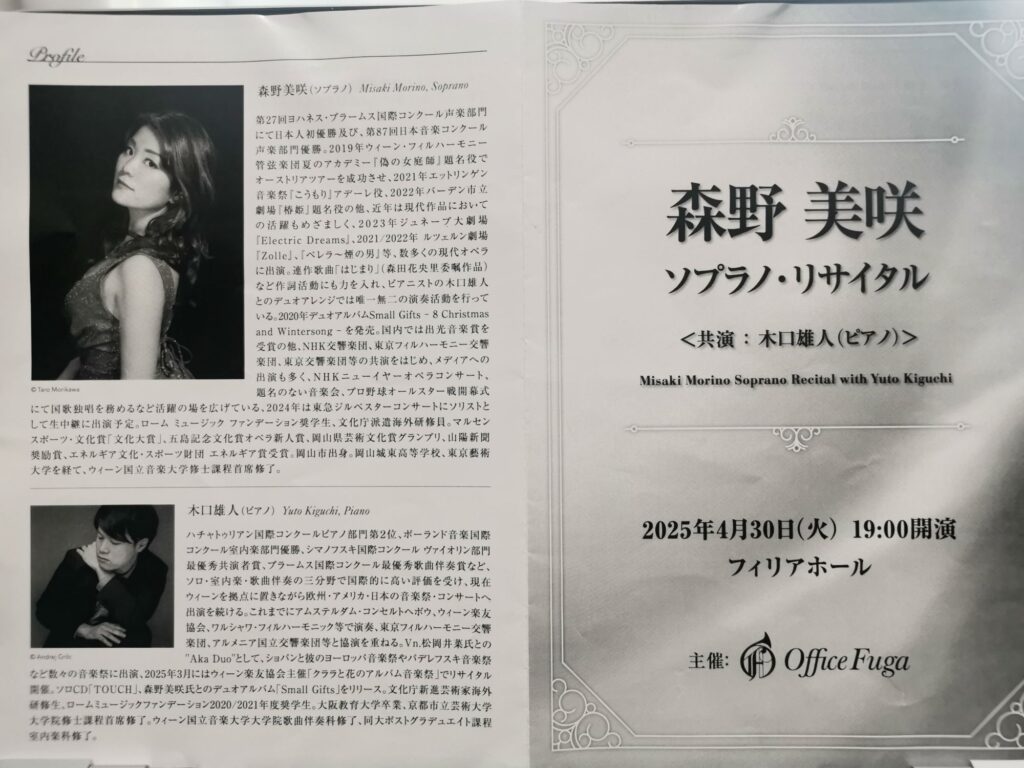 森野美咲さんと木口雄人さんの2人によるリサイタルはもう何回目かわからないほどですが、2人のとっても息のあった 空気感が良くて、聞いていて幸せな気持ちになるコンサートです。