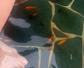 ずっと温泉に入ってるから角質もふやけていると見えて、じっとしてると、足じゅう魚がまとわりつきます。