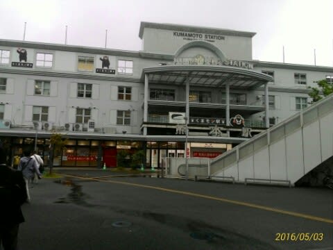 熊本駅正面。やっぱり「くまモン駅」って書いてある!