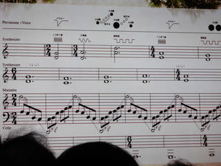 火焔型土器の鶏冠突起(というんですって、あのでっぱったとこ)の形を五線譜に音譜として並べたり、渦巻き模様みたいなのを写し取ったり。土器の模様を音譜に置き換えてらっしゃるのです。