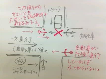 右側走行してきた自転車とトラックが出会い頭にぶつかりそうになったんです。