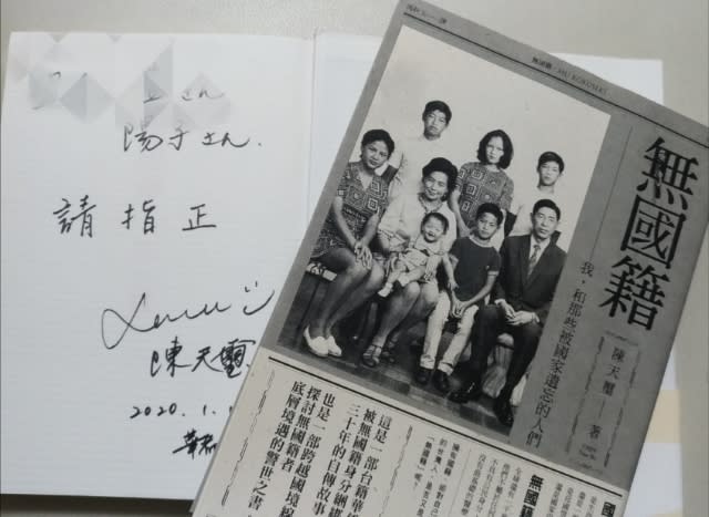あるとき、ある台湾大学の先生が来日中に陳天璽さんの「無国籍」をたまたま本屋で手に取って、読んだのだそう。そしてぜひ台湾で出版したいと思ったらしく、その翻訳を私の友人に頼んだらしい。私の友人も学生時代に会ったことのある家族の話でもあり、喜んで引き受けたのだそうだ。