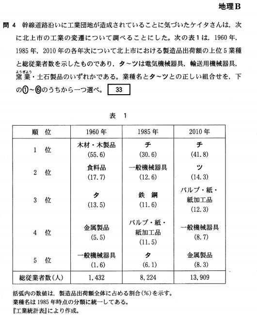 岩手県北上市の個別の状況を受験生が知っていることを求めるのは酷だと思うので、何らかの手がかりをもとに推理していく事を求める問題だとは思うのですが、1985年以降突然現れて、生産額が一位になり2010年もさらに伸びている「チ」と、2010年から突然現れて2位に位置づけた「ツ」。これが、窯業・土石製品ではないだろうというのはわかるのですが、では輸送用機械器具なのか電気機械器具なのか?