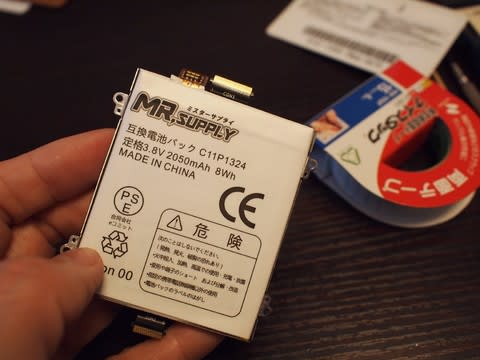 2年前に、液晶ガラスを割って、自力でガラス交換した私のスマホ、ASUS Zenfone5ですが、もう3年以上使っているせいか、電池が持たなくなってきました。最近は1時間くらい使うと電池残が15%くらいになっちゃったり、40%くらい残ってるのに突然電源落ちたりと、挙動がおおいに不審。