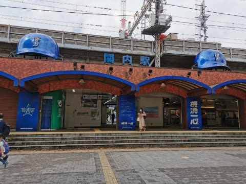 横浜ベイスターズ本拠地の横浜スタジアム最寄りなので、ベイスターズ仕様になっています。ヘルメット!!