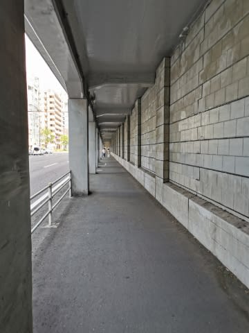 廃線跡が歩けるのはほんの一部区間で、残りは高架下が殺風景な通路になっているだけです。この高架下の壁を絵を描いたりしてもいいんじゃないかなと夫と話しながら歩きました。若いアーティストに解放したら楽しくなりそうですけどね。